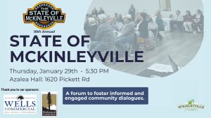 Save the date for the 10th annual State of McKinleyville on Thursday, January 29th from 5:30 to 8:00 pm at Azalea Hall in McKinleyville.